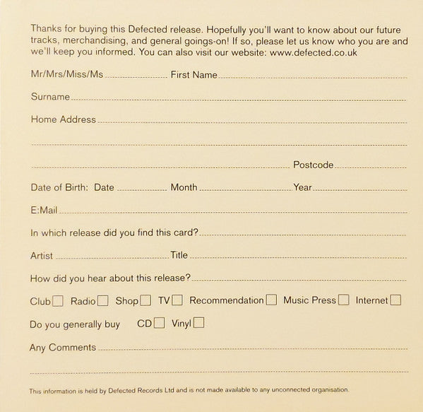 Shipped in heavy-duty record mailers with inner and outer sleeves, with vinyl placed behind the jacket to prevent seam splits.