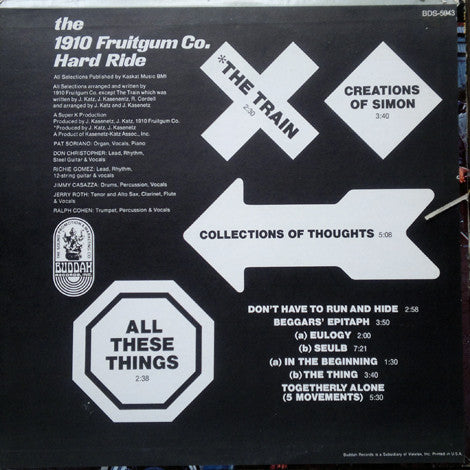 "Hard Ride" by 1910 Fruitgum Company features a blend of bubblegum pop and psychedelic rock, reflecting the playful and experimental spirit of the era, with its catchy melodies and vibrant instrumentation.