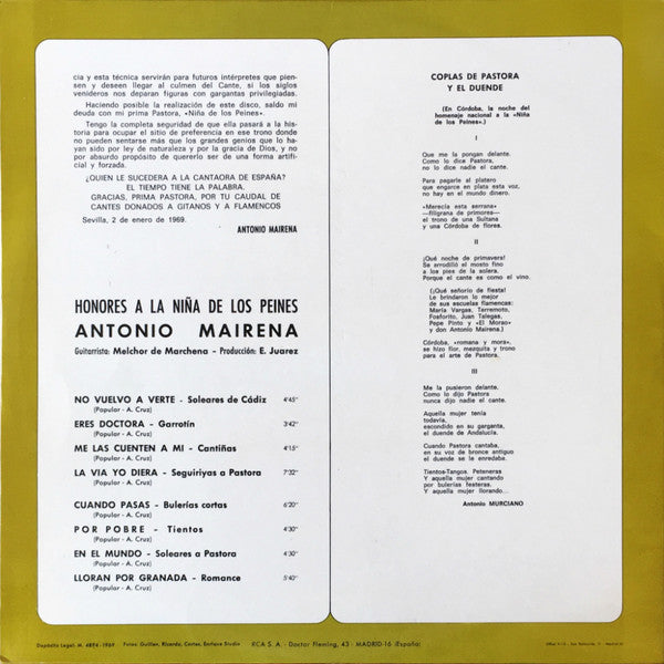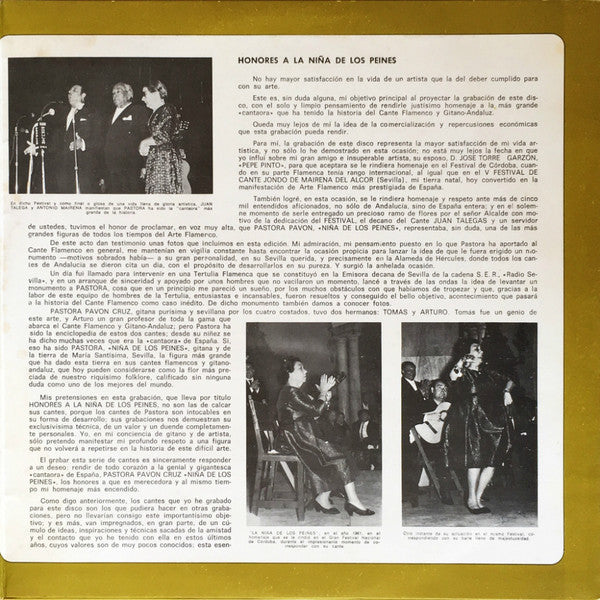 "Honores A La Niña De Los Peines" is a tribute album by Antonio Mairena that highlights the profound influence of the legendary flamenco singer La Niña de los Peines, showcasing Mairena's deep connection to traditional flamenco styles and his role in preserving its rich heritage.