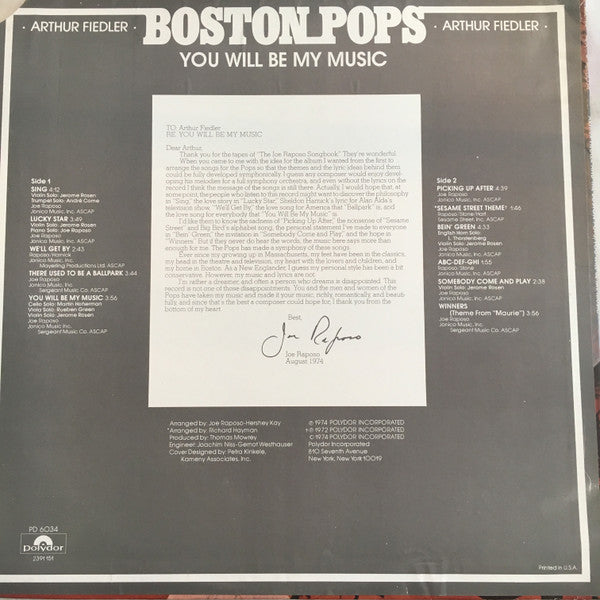 "You Will Be My Music" features the Boston Pops Orchestra under the baton of Arthur Fiedler, presenting a delightful blend of classical and popular music, including arrangements that highlight the orchestra's versatility and charm.