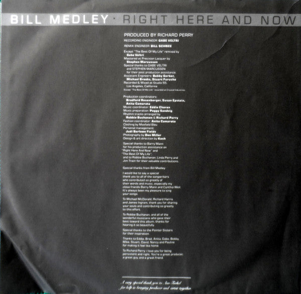 "Right Here And Now" features Bill Medley's rich baritone voice and blends elements of pop and R&B, highlighting his ability to convey deep emotion through both original songs and covers.