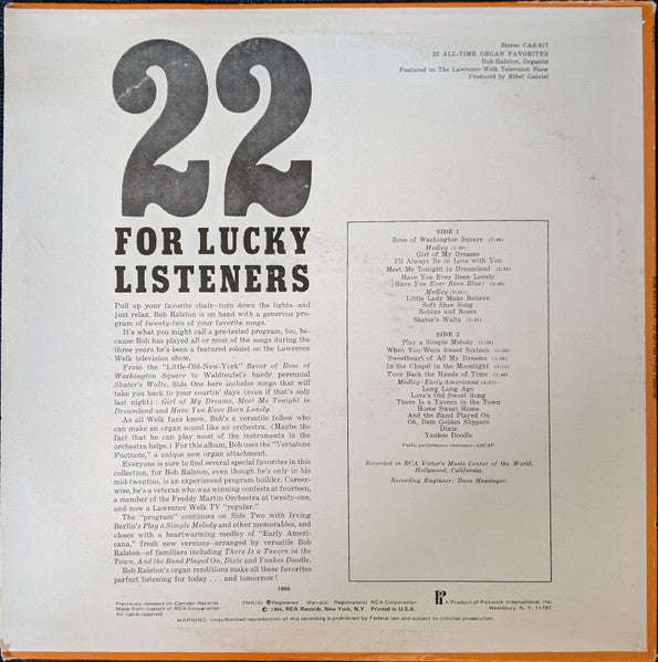 "22 All-Time Organ Favorites" features Bob Ralston's skilled organ performances, blending classic tunes with a rich, melodic style that highlights the versatility of the instrument in popular music.