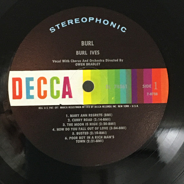"Burl" features Burl Ives' rich baritone voice and blends folk, country, and traditional American music, reflecting his deep roots in storytelling and folk culture.