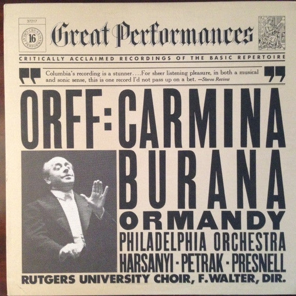 This recording of Carl Orff's "Carmina Burana" by The Philadelphia Orchestra under the baton of Eugene Ormandy is notable for its powerful orchestration and choral arrangements, bringing to life the dramatic and evocative themes of fate and fortune found in the medieval texts.