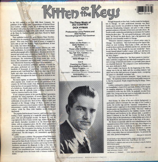 "Kitten On The Keys: The Music of Zez Confrey" features Dick Hyman's vibrant piano interpretations of Confrey's innovative ragtime compositions, highlighting the playful and syncopated rhythms that defined early American jazz.