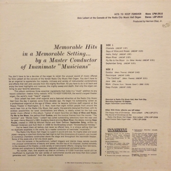 "Dick Leibert - Hits To Keep Forever" features the renowned organist's interpretations of popular tunes, showcasing his mastery of the theater organ and his ability to blend classical and contemporary styles in a captivating manner.