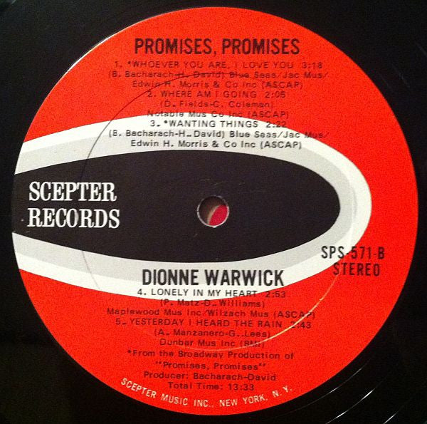 "Promises, Promises" features Dionne Warwick's smooth blend of pop and soul, with its title track written by Burt Bacharach and Hal David, highlighting the duo's signature sound that became synonymous with Warwick's career.