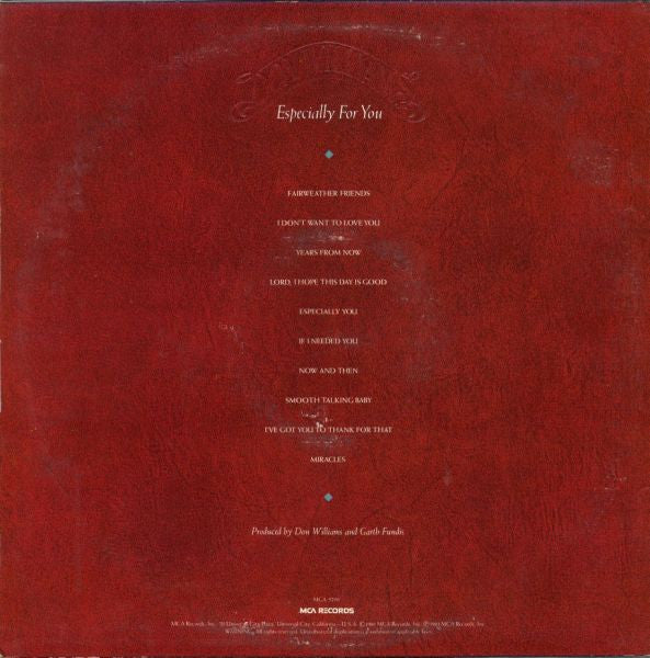"Especially For You" features Don Williams' signature smooth country sound, blending heartfelt storytelling with gentle melodies, and includes the beloved track "I Wouldn't Want to Live If You Didn't Love Me."