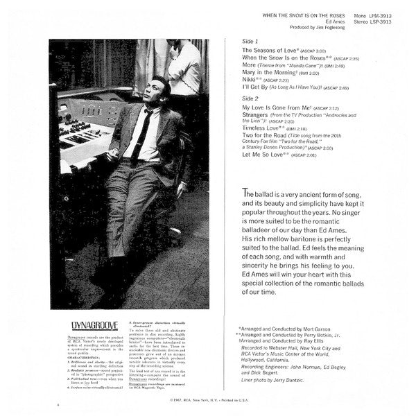 "When The Snow Is On The Roses" features Ed Ames' rich baritone voice delivering a blend of pop and traditional standards, with notable orchestral arrangements that highlight his emotive storytelling.