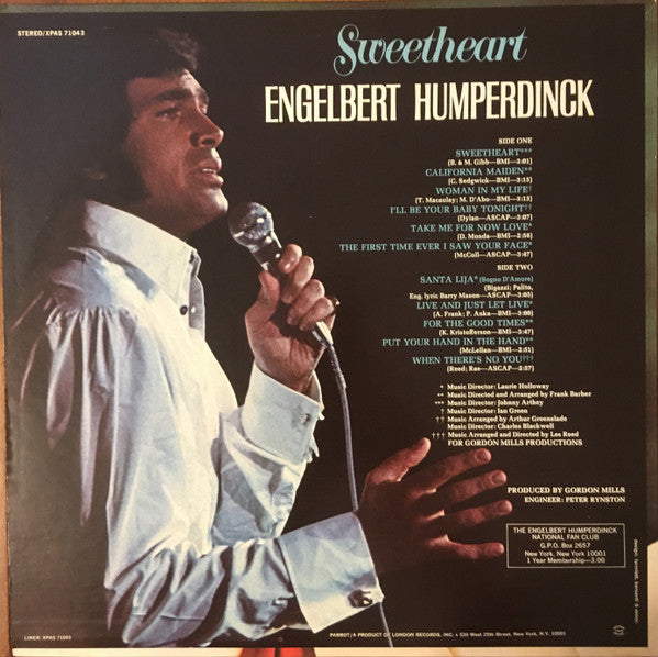 "Sweetheart" features Engelbert Humperdinck's signature romantic ballad style, blending lush orchestration with heartfelt lyrics, and includes a mix of original songs and covers that highlight his smooth vocal delivery.