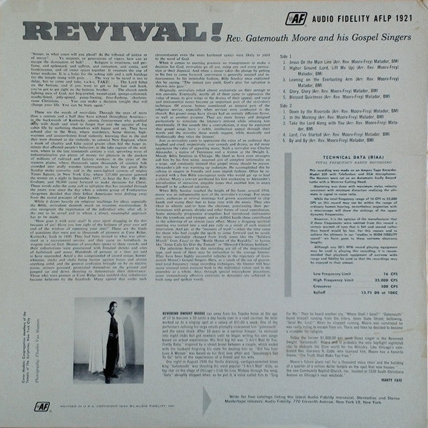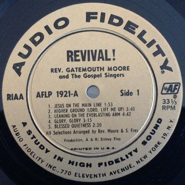 "Revival!" features Gatemouth Moore's powerful blend of traditional gospel and blues, highlighting his distinctive vocal style and the heartfelt harmonies of his choir, which together create a deeply spiritual and uplifting listening experience.
