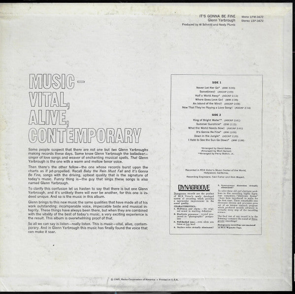 "It's Gonna Be Fine" features Glenn Yarbrough's rich baritone voice, blending folk, pop, and traditional elements, and is notable for its heartfelt interpretations and arrangements that highlight his emotional storytelling.