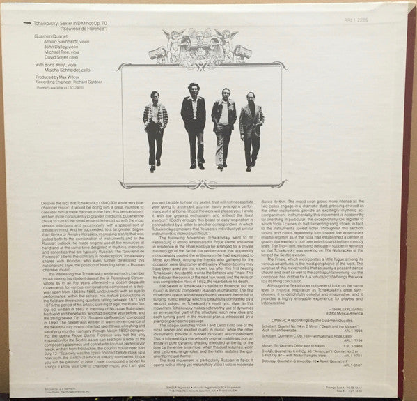 This album features the Guarneri Quartet alongside renowned musicians Boris Kroyt and Mischa Schneider performing Tchaikovsky's "Souvenir de Florence," a work celebrated for its lush melodies and emotional depth, reflecting the composer's admiration for the Italian landscape and culture.