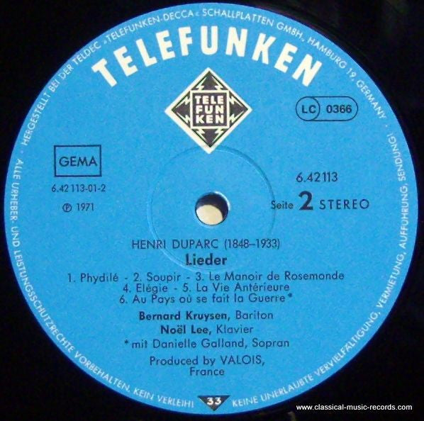 This album features the lyrical art songs of Henri Duparc, performed by tenor Bernard Kruysen and pianist Noël Lee, highlighting the rich emotional depth and lush harmonies characteristic of French mélodie.