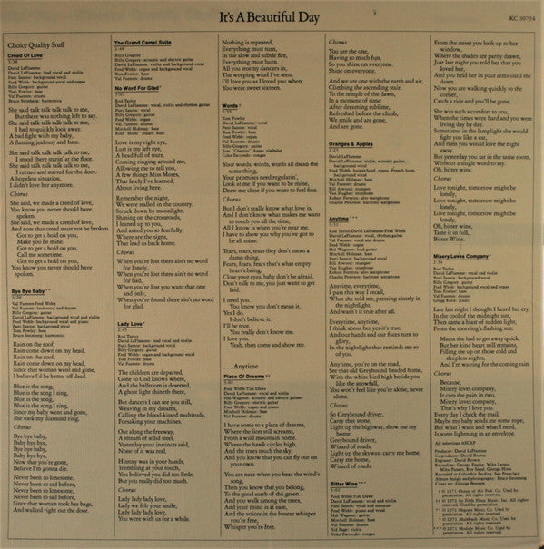 "It's A Beautiful Day - Choice Quality Stuff / Anytime" features a blend of rock and jazz influences, highlighting the band's signature sound characterized by vibrant melodies and intricate arrangements, with the track "White Bird" often celebrated for its ethereal quality and lyrical depth.
