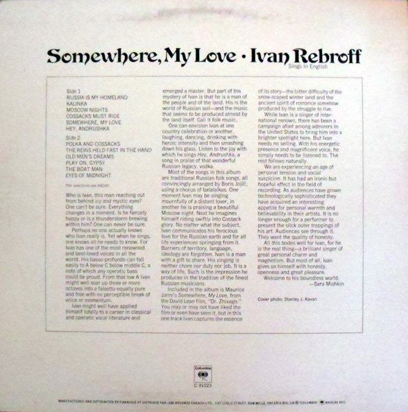 "Ivan Rebroff - Somewhere, My Love" features the rich baritone voice of Ivan Rebroff, known for his unique blend of classical and folk influences, which brings a distinctive emotional depth to the album's romantic themes.