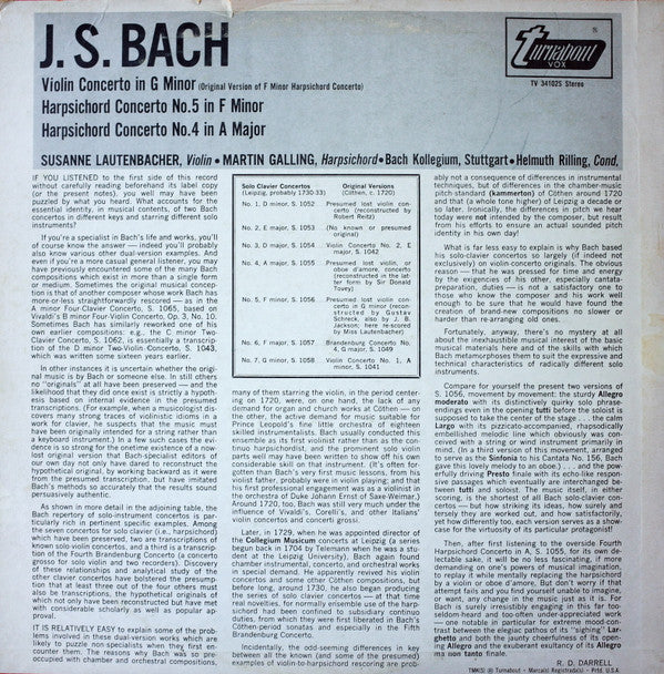 Johann Sebastian Bach, Susanne Lautenbacher, Martin Galling - Violin Concerto In G Minor / Harpsichord Concerto No. 5 In F Minor / Harpsichord Concerto No. 4 In A Major