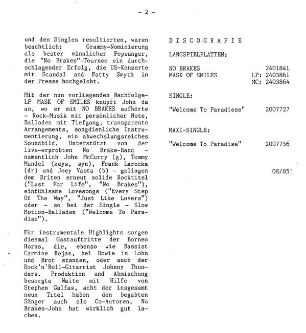 "Mask of Smiles" features a blend of rock and pop elements, with John Waite's emotive vocals driving the album's exploration of themes like love and loss, and it includes the hit single "Missing You," which became one of his signature songs.