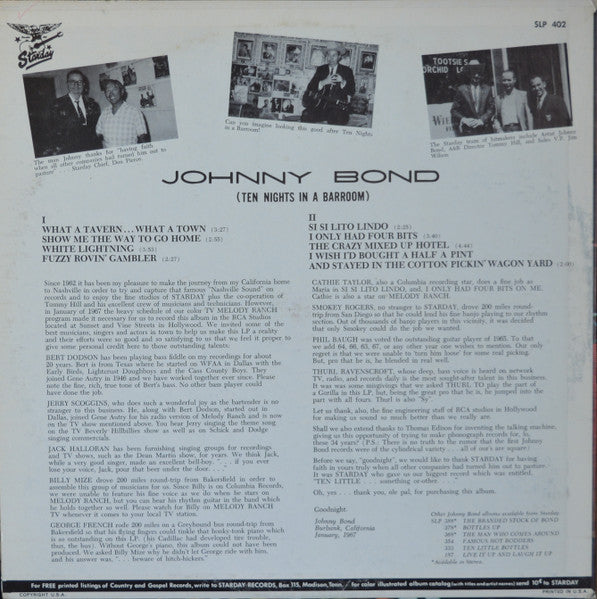 "Ten Nights In A Barroom" features Johnny Bond's distinctive blend of traditional country music and storytelling, reflecting the vibrant honky-tonk culture of the American West.