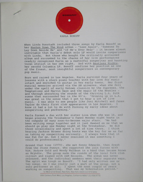 "Restless Nights" features Karla Bonoff's signature blend of folk and soft rock, with poignant storytelling that has resonated with listeners and has been covered by notable artists like Linda Ronstadt and Bonnie Raitt.