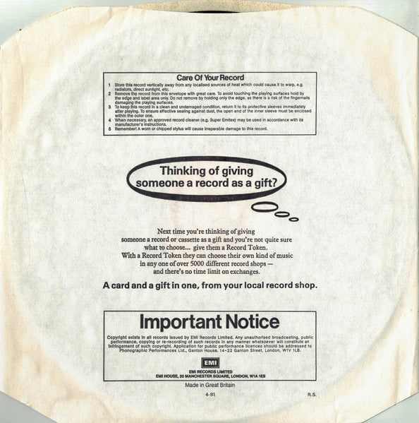Shipped in heavy-duty record mailers with inner and outer sleeves, with vinyl placed behind the jacket to prevent seam splits.