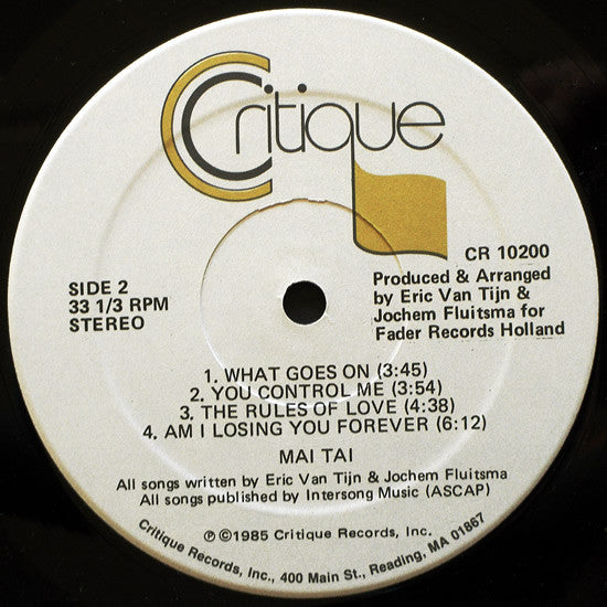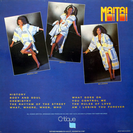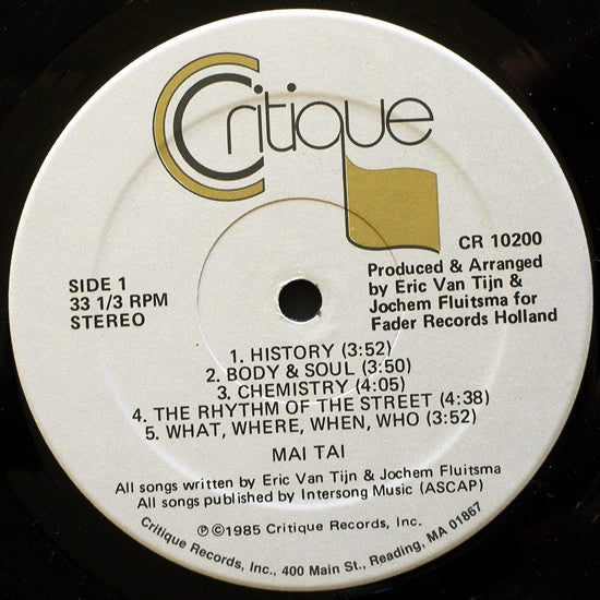 The self-titled album by Mai Tai features a blend of pop and dance music, highlighted by their hit single "History," which showcases their signature harmonies and infectious melodies.