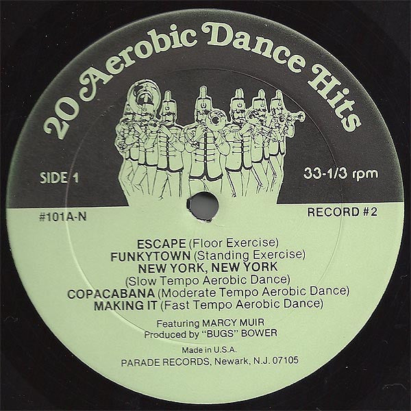 "20 Aerobic Dance Hits!" by Marcy Muir features a vibrant collection of upbeat tracks specifically designed to energize aerobic workouts, reflecting the fitness craze of its time with a blend of pop and dance music influences.