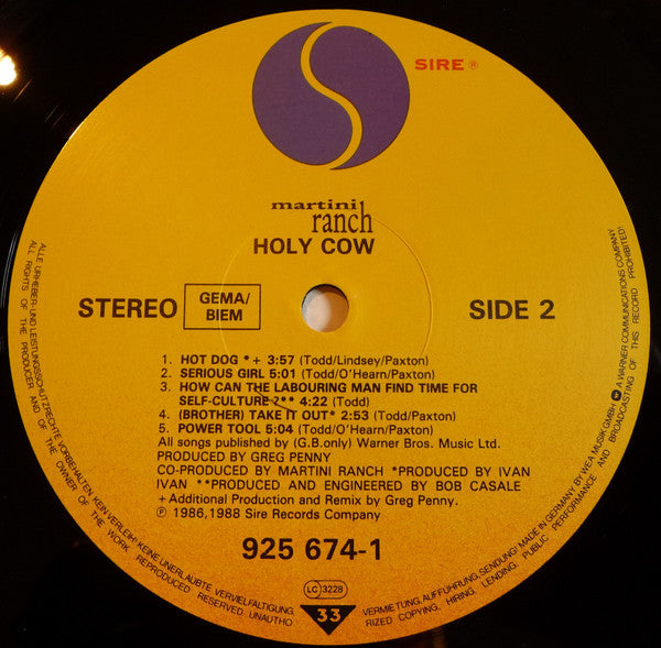 "Holy Cow" by Martini Ranch features a blend of new wave and rock, notable for its collaboration with producer and musician Dan Hartman, which adds a distinctive pop sensibility to the band's sound.