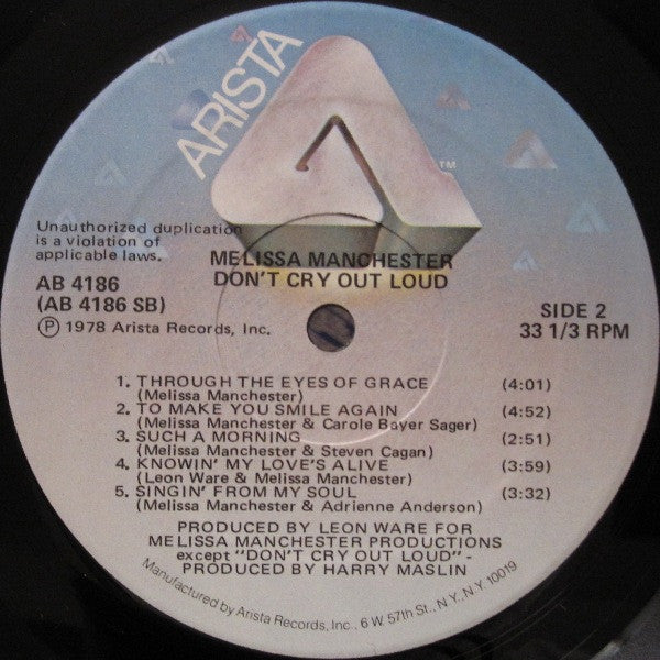 "Don't Cry Out Loud" features Melissa Manchester's emotive vocal style and includes the iconic title track, which became one of her signature songs and showcases her ability to blend pop and adult contemporary influences.