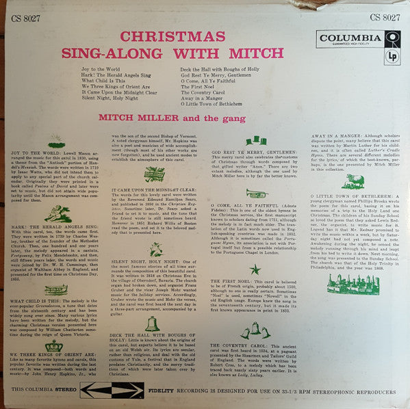 "Christmas Sing-A-Long With Mitch" features Mitch Miller leading sing-along renditions of classic holiday songs, reflecting the popular mid-20th century trend of communal music-making and showcasing Miller's signature blend of orchestral arrangements and vocal harmonies.