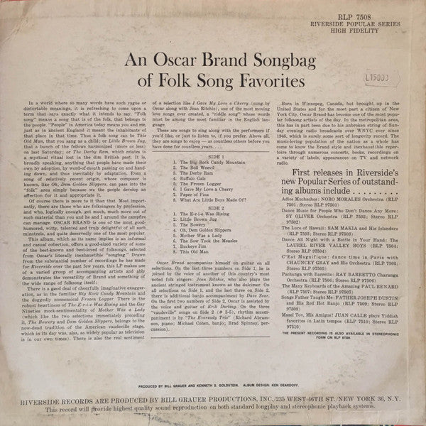 An Oscar Brand Songbag features a delightful collection of folk songs that reflect Brand's deep commitment to preserving and popularizing traditional American music, showcasing his engaging storytelling and charismatic vocal style.