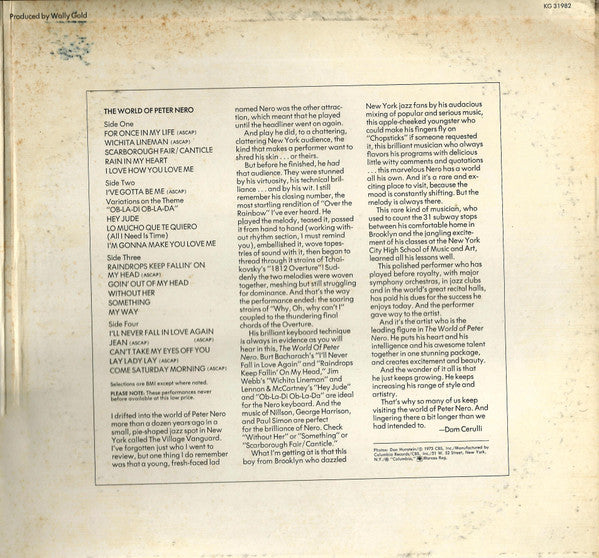 "The World Of Peter Nero" features the talented pianist and conductor blending classical, pop, and jazz influences, highlighting his unique ability to interpret a wide range of musical styles with a personal touch.