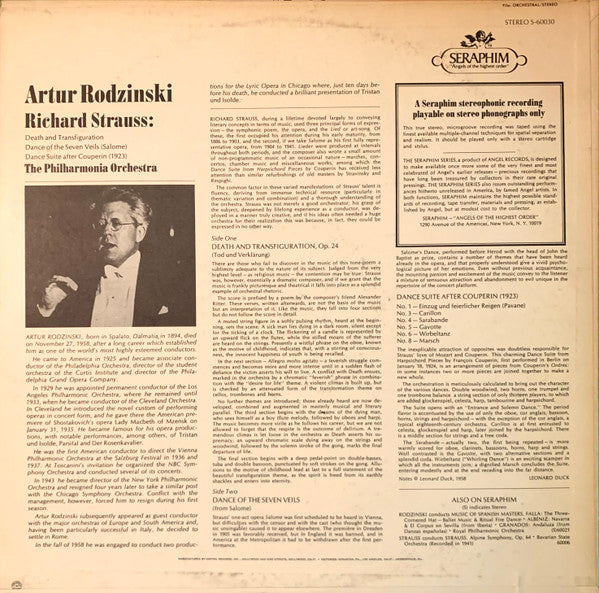 This album features the Philharmonia Orchestra under Artur Rodzinski's baton, highlighting Strauss's lush orchestration and dramatic flair, particularly in the evocative "Death and Transfiguration" and the sensuous "Dance of the Seven Veils" from "Salome," showcasing the composer's ability to blend emotional depth with intricate musical textures.