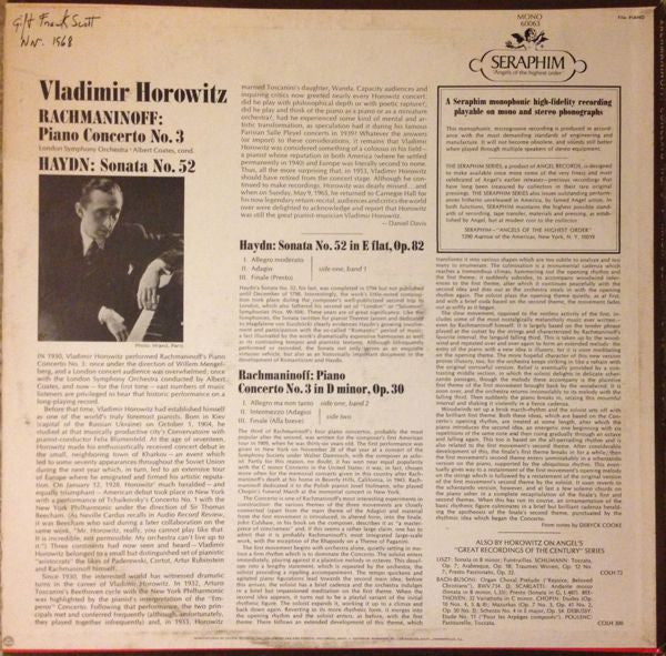 This album features Vladimir Horowitz's renowned interpretation of Rachmaninoff's Piano Concerto No. 3, celebrated for its technical demands and emotional depth, alongside Haydn's Sonata No. 52, highlighting the contrast between Romantic intensity and Classical elegance.