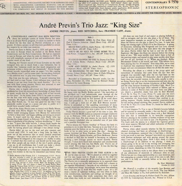 The André Previn Trio - King Size! features a delightful blend of jazz and classical influences, highlighting Previn's virtuosity on piano alongside the dynamic interplay of his trio, making it a notable example of his ability to bridge genres.