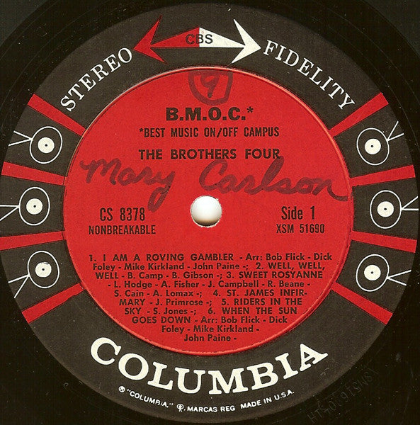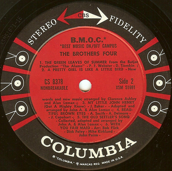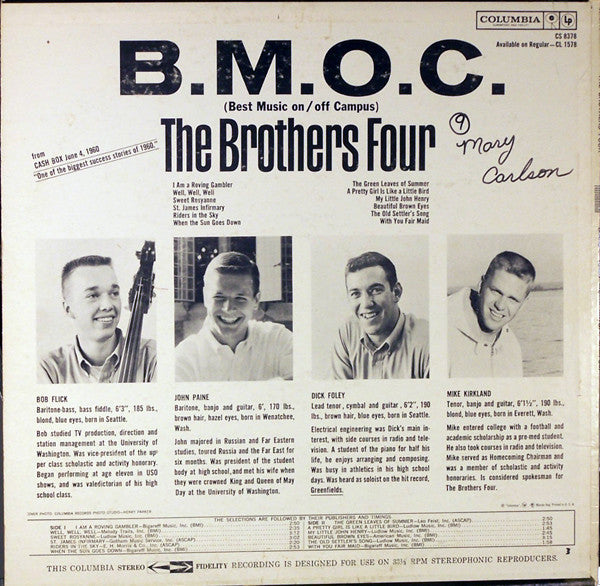 B.M.O.C. (Best Music On / Off Campus) by The Brothers Four features a blend of folk and pop harmonies, highlighting the group's collegiate roots and their ability to resonate with both campus life and broader audiences.
