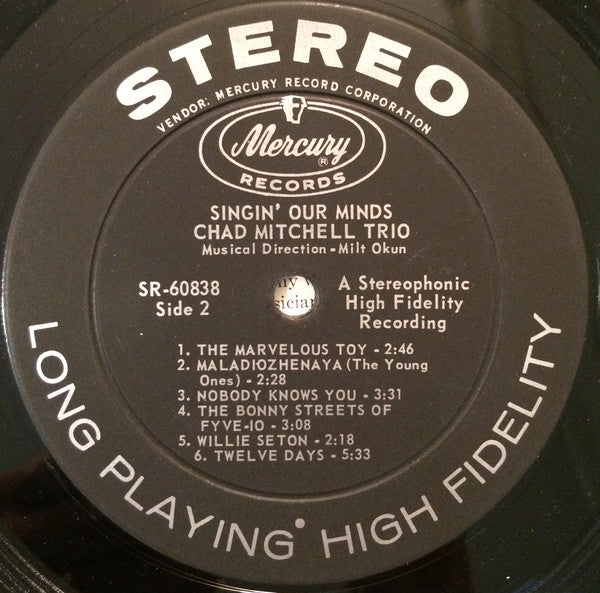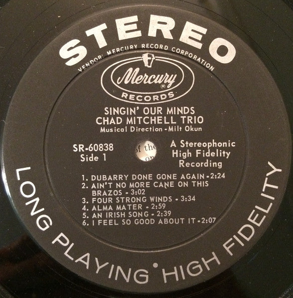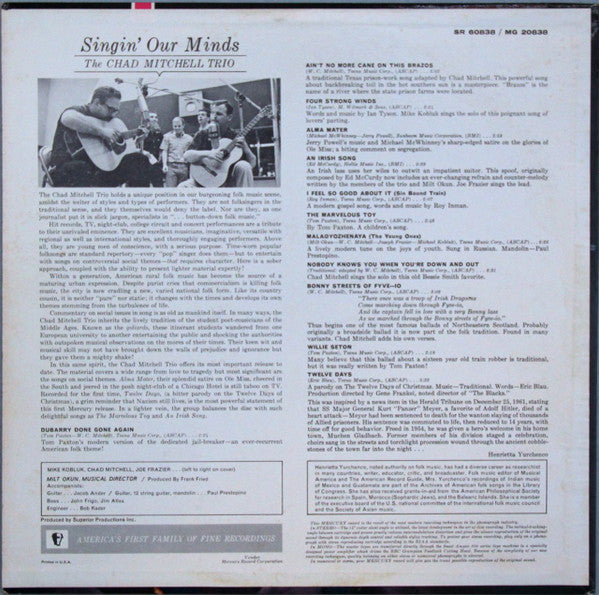 "The Chad Mitchell Trio - Singin' Our Mind" features a blend of folk and pop influences, highlighting the trio's harmonies and socially conscious lyrics that reflect the spirit of the era.