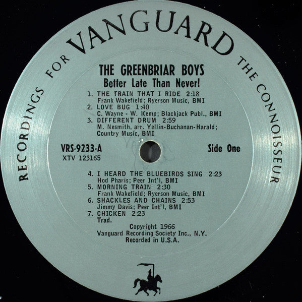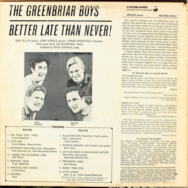 "Better Late Than Never!" features the Greenbriar Boys' blend of bluegrass and folk, highlighting their harmonious vocals and instrumental prowess, and is notable for its revival of traditional American roots music.