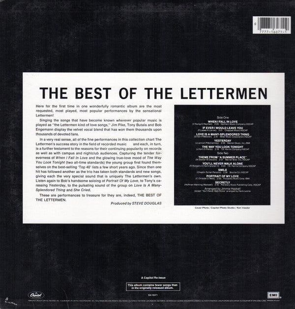 The Best Of The Lettermen compiles the harmonious vocal stylings of the trio, known for their smooth blend of pop and soft rock, and features their signature lush arrangements that highlight their romantic ballads and nostalgic charm.