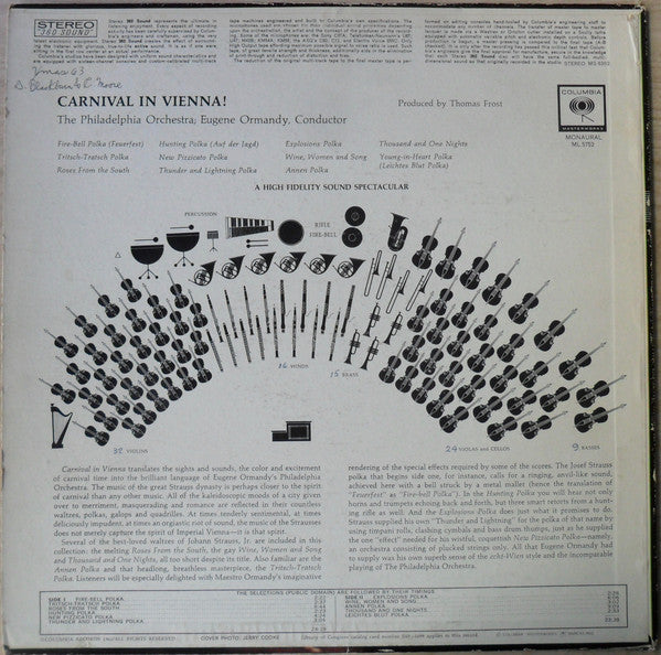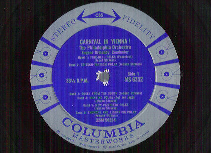 "Carnival In Vienna!" features the Philadelphia Orchestra under the baton of Eugene Ormandy, renowned for its vibrant interpretations of light classical music, particularly the works of Johann Strauss, and is notable for its lively orchestration and celebratory spirit that reflects the grandeur of Viennese tradition.