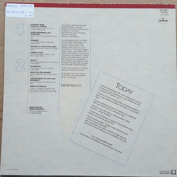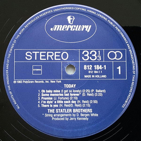 The Statler Brothers' album "Today" features a blend of traditional country and gospel influences, highlighting their signature harmonies and storytelling prowess, while also including a poignant tribute to their musical roots with the song "The Class of '57."